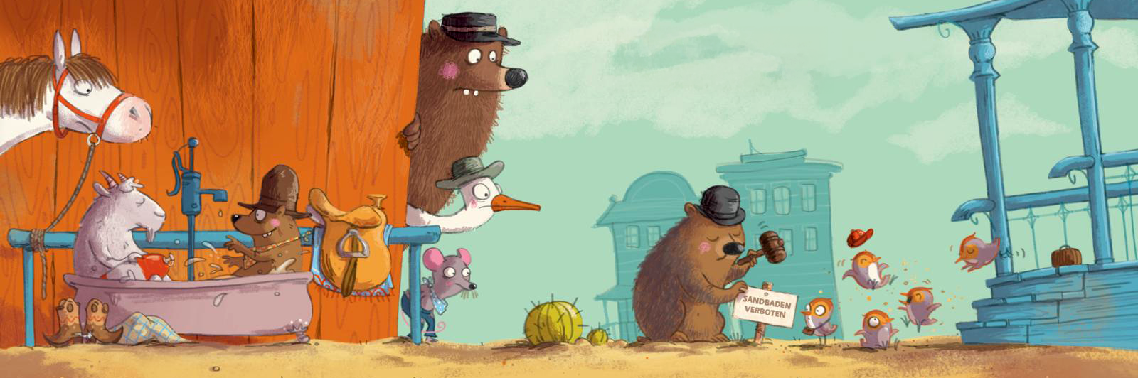 Daniel Fehr erzählt in seinem neuen Bilderbuch subtil und amüsant von einer bigotten Gesellschaft, die keine Fremden aufnehmen will und diesen selbst die Schuld an ihrer Nichtintegration gibt. Dafür das Western-Genre zu wählen, ist klug und angesichts der Entwicklungen in den USA hochaktuell. Barbara Scholz erschafft in erdig-sonnigen Farbtönen eine detailreiche Westernwelt, wobei sie die Emotionen ihrer Figuren mit wenigen Strichen überzeugend ins Bild setzt. Ihre Tierwelt ist divers – so wie es (Einwanderungs-)Gesellschaften nun mal sind: Da spielen Eule und Maus zusammen Karten, Geier und Schlange sind befreundete Revolverhelden. Doch als die fünf fremden kleinen Vögel ankommen und das „Stadtbild“ stören, muss eingegriffen werden.